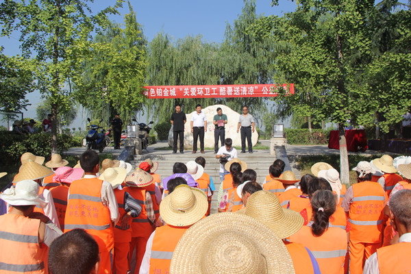 活動當天,在鄠邑區相關領導的陪同下,陜西有色置業有限公司負責人樊躍峰帶領公司各部門經理來到澇河畔的有色鉑金城運動公園,親手將一份份的降暑物品送給環衛工人們,并向他們表達了誠摯的關懷和敬意。